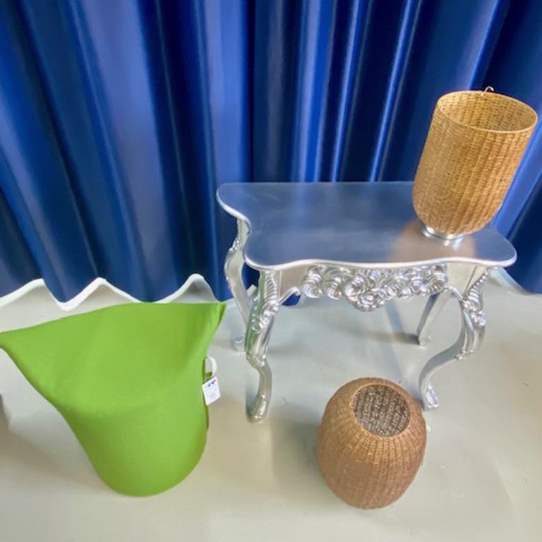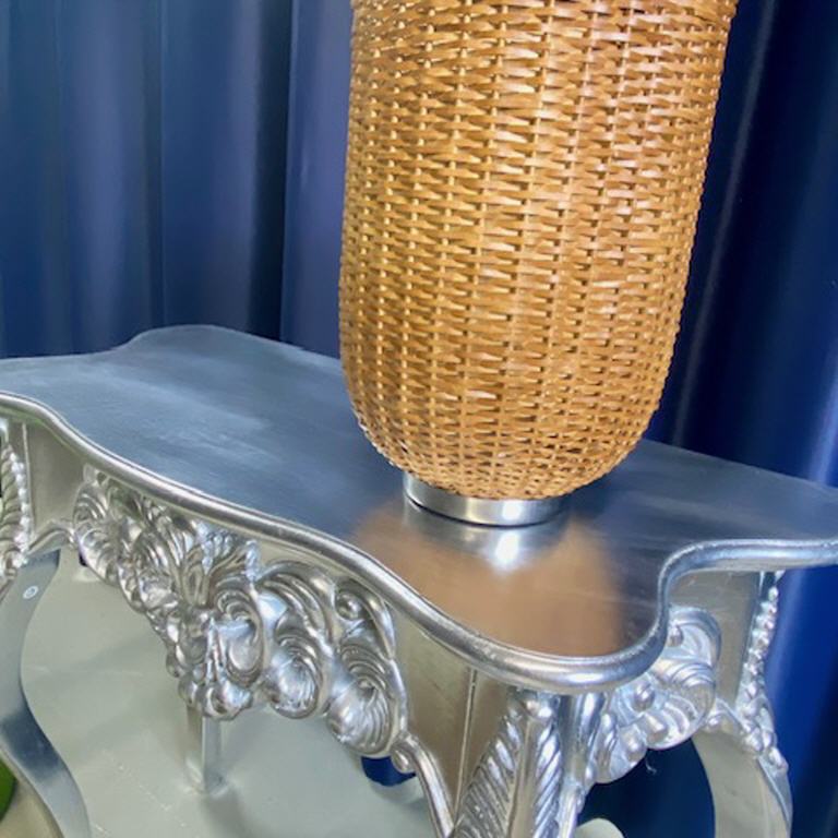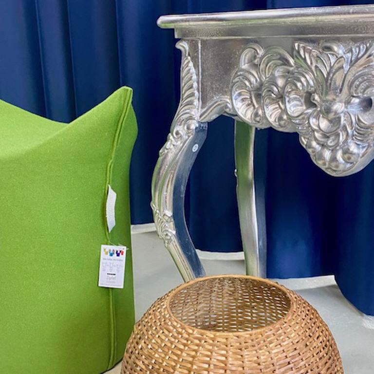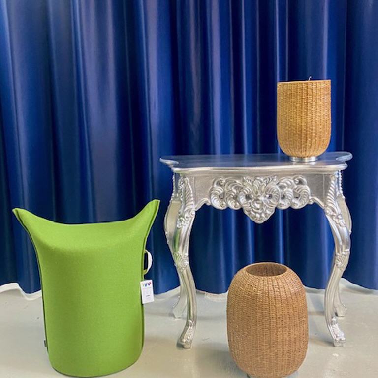 Konsole: silber Holz Br.83 H.75 T.37 neu € 90,00 Zipfel Hocker Werther: grün Schurwolle H.50 neu € 100,00 a.Windlicht Metall - Flechtoptik - Fink neu € 35,00